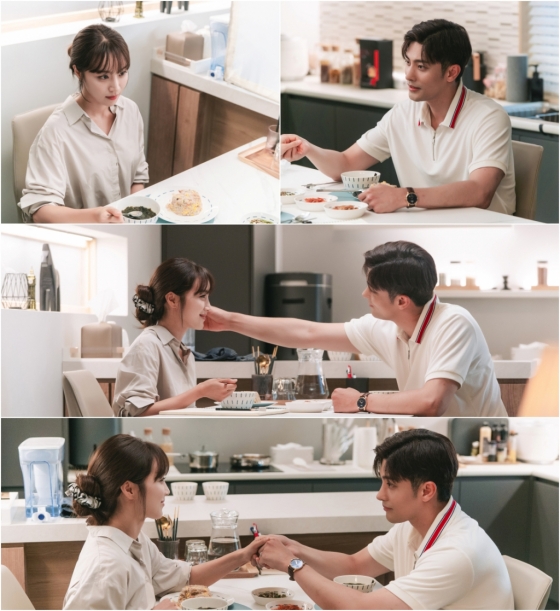 이와 관련 18일(오늘) 방송될 '완결정' 7회에서는 성훈과 정유민의 달콤한 '신혼 만끽 커플샷'이 포착돼 이목을 집중시키고 있다. 극 중 서도국(성훈)과 한이주(정유민)가 다정하게 저녁 식사를 함께하는 장면. 서도국은 과거 누군가가 자신의 밥에 약을 탄 이후 잘 먹지 못했던 한이주가 편하게 밥을 먹자 흐뭇하게 바라보다 머리를 쓰다듬으며 애정 가득한 행동을 드러낸다. 한이주는 그런 서도국의 사랑이 느껴진다는 듯 행복한 표정으로 서도국을 또렷이 쳐다보는 것. 이어 두 사람은 손을 맞잡은 채 견고한 마음을 표현하며 저녁 식사를 설렘의 장으로 만든다. 서로를 진심으로 사랑하게 된 서도국과 한이주가 앞으로 어떤 가슴 설레는 신혼 로맨스를 보여줄지 관심을 고조시킨다.