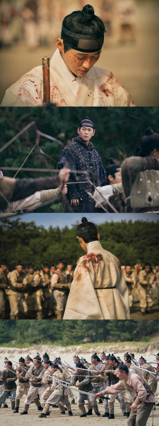 18일 '연인' 제작진이 최종회 방송을 앞두고 공개한 사진에는 1회 오프닝 속 모습 그대로 피투성이가 된 채 바닷가에 있는 이장현의 모습이 담겨 있다. 홀로 선 이장현 앞에는 수십의 사내들이 칼을 들고 있다. 무엇보다 눈길을 끄는 것은 남연준(이학주 분)의 존재이다. 남연준이 갑주를 입은 채 활을 겨눈 사내들 사이에 서 있는 것. 남연준의 날카롭게 번뜩이는 눈빛, 의미심장한 눈빛이 궁금증을 유발한다. 이곳에 남연준이 왜 있을까. 이장현과 남연준이 맞서게 되는 것일까.