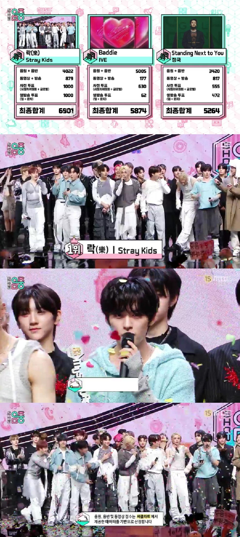 18일 방송된 MBC '쇼! 음악중심'에는 스트레이 키즈 '락', 아이브 'Baddie', 정국의 'Standing Next to You'가 1위 후보에 올랐다.
