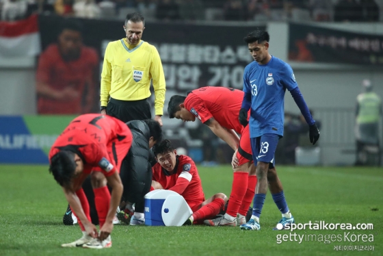 아찔한 장면도 있었다. 손흥민은 싱가포르 선수의 태클에 걸려 넘어졌고 통증을 호소하는 장면이 포착되기도 했다.