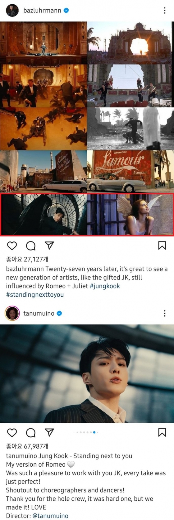 바즈 루어만은 지난 3일 정국이 발매한 솔로 앨범 'GOLDEN'(골든)의 타이틀곡 'Standing Next to You'(스탠딩 넥스트 투 유)의 뮤직비디오 장면과 1996년 자신이 감독, 공동 각본, 제작한 대작 영화 '로미오와 줄리엣'의 장면을 일치시켜 편집한 사진을 게시하며 뮤직비디오에 대한 뜨거운 관심을 엿보게 했고 보는 이들에게는 신선한 재미를 선사했다.