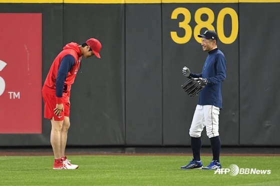 스즈키 이치로(오른쪽)에게 인사하는 오타니 쇼헤이. /AFPBBNews=뉴스1