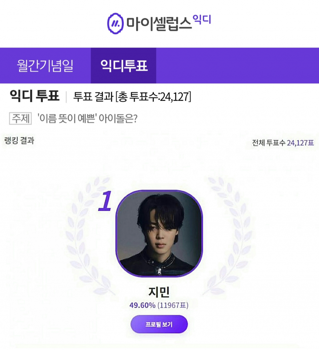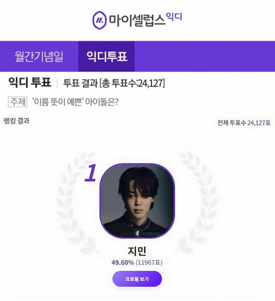 지민은 총 투표수 2만 4127표 중 1만 1967만표를 획득해 49.60%의 득표율로 1위를 차지했다. 지민의 매력으로는 62%의 '이끌리다'에 이어 '예쁜', '센스있는', '낭만적', '감성적' 순으로 지지를 받았다.