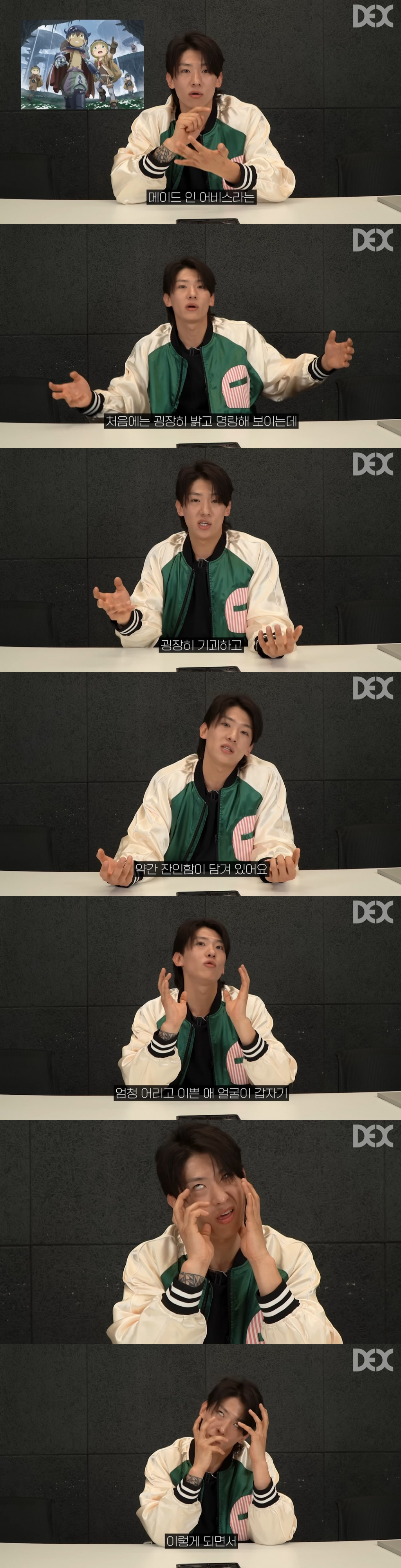 하지만 덱스는 아무렇지 않게 '메이드 인 어비스'를 추천했다. 심지어 "반전이 어마어마하다. 처음에는 굉장히 밝고 명량해보이는데 굉장히 기괴하고 끔찍하고 잔인함이 담겨있다. 주인공이 또 여자다. 굉장히 끔찍한 일을 많이 당한다. 처음에는 되게 밝다가 점점 딥해진다. 몰입도가 장난 아니고 굉장히 잔인하다. 엄청 어리고 이쁜 애 얼굴이 갑자기 이렇게 되면서.."라며 해당 작품을 좋아하는 이유를 솔직하게 밝혔다.
