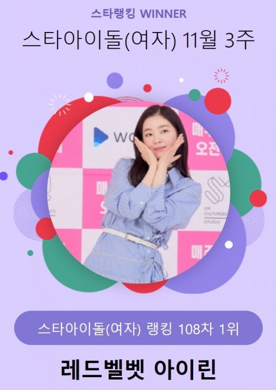 아이린은 지난 16일 오후 3시 1분부터 23일 오후 3시까지 진행된 11월 3주(108차) 스타랭킹 스타아이돌 여자 랭킹 투표에서 소녀시대 윤아, 태연을 꺾고 1위를 차지했다.