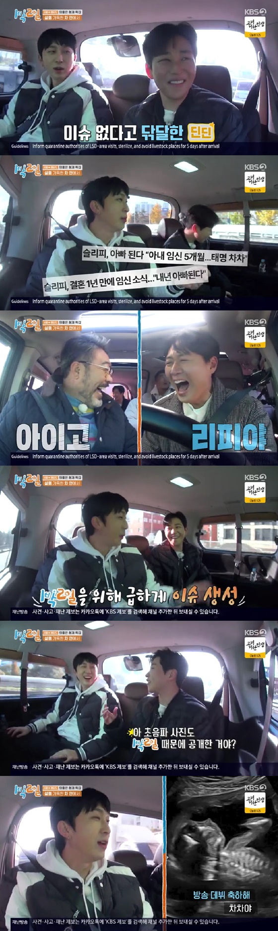 이에 딘딘이 "초음파 사진도 '1박 2일'을 위해서 공개한 거냐"고 묻자 슬리피는 당연하다는 듯 "그렇다. 기사를 냈다니까"라고 답했다.