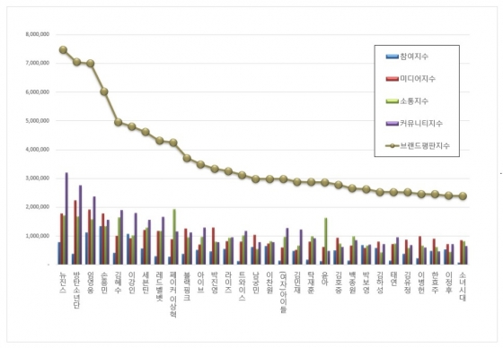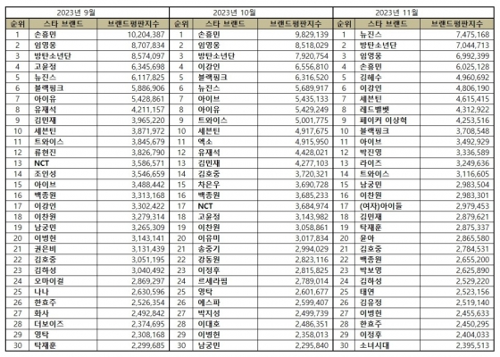 2023년 11월 스타 브랜드평판 30위 순위는 뉴진스, 방탄소년단, 임영웅, 손흥민, 김혜수, 이강인, 세븐틴, 레드벨벳, 페이커 이상혁, 블랙핑크, 아이브, 박진영, 라이즈, 트와이스, 남궁민, 이찬원, (여자)아이들, 김민재, 탁재훈, 윤아, 김호중, 백종원, 박보영, 김하성, 태연, 김유정, 이병헌, 한효주, 이정후, 소녀시대 순으로 분석됐다.
