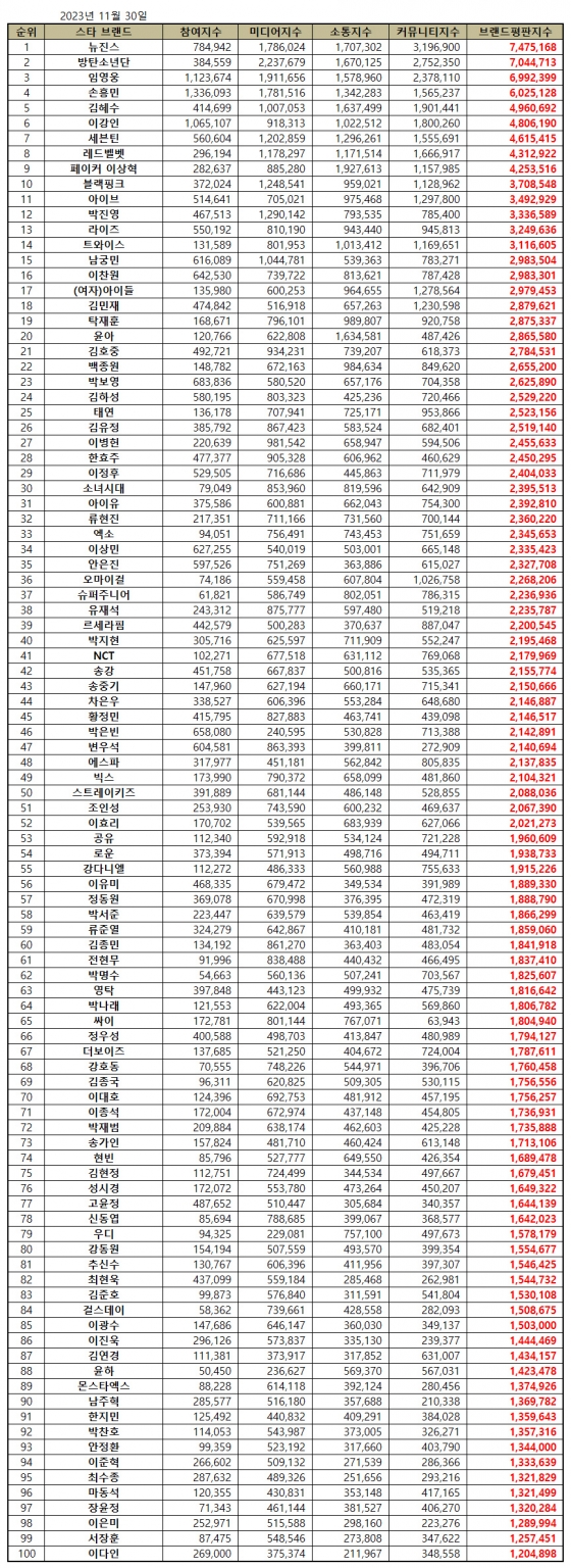 스타 브랜드평판 2023년 11월 빅데이터 분석 100위는 뉴진스, 방탄소년단, 임영웅, 손흥민, 김혜수, 이강인, 세븐틴, 레드벨벳, 페이커 이상혁, 블랙핑크, 아이브, 박진영, 라이즈, 트와이스, 남궁민, 이찬원, (여자)아이들, 김민재, 탁재훈, 윤아, 김호중, 백종원, 박보영, 김하성, 태연, 김유정, 이병헌, 한효주, 이정후, 소녀시대, 아이유, 류현진, 엑소, 이상민, 안은진, 오마이걸, 슈퍼주니어, 유재석, 르세라핌, 박지현, NCT, 송강, 송중기, 차은우, 황정민, 박은빈, 변우석, 에스파, 빅스, 스트레이키즈, 조인성, 이효리, 공유, 로운, 강다니엘, 이유미, 정동원, 박서준, 류준열, 김종민, 전현무, 박명수, 영탁, 박나래, 싸이, 정우성, 더보이즈, 강호동, 김종국, 이대호, 이종석, 박재범, 송가인, 현빈, 김현정, 성시경, 고윤정, 신동엽, 우디, 강동원, 추신수, 최현욱, 김준호, 걸스데이, 이광수, 이진욱, 김연경, 윤하, 몬스타엑스, 남주혁, 한지민, 박찬호, 안정환, 이준혁, 최수종, 마동석, 장윤정, 이은미, 서장훈, 이다인 순으로 분석됐다.
