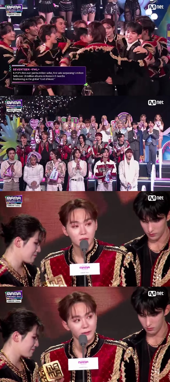 마이크를 잡은 우지는 눈물을 글썽이며 "모두가 '너희 사람이 너무 많아서 안 된다'고 했다. 세븐틴이라는 이름으로 음악을 11년째 만들고 있는데, 끝까지 더 좋은 음악을 선물하는 팀이 되도록 노력할 것"이라고 다짐했다.