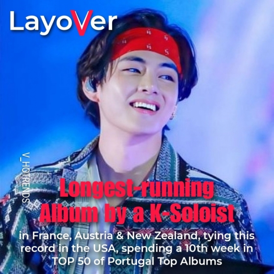 뷔의 '레이오버'(Layover) 앨범은 지난 11월 17일 프랑스 음반 협회의 SNEP '톱 앨범' 차트에서 K팝 솔로 가수 최초로 최장기간인 10주 연속 차트인하는 대기록을 세웠다
