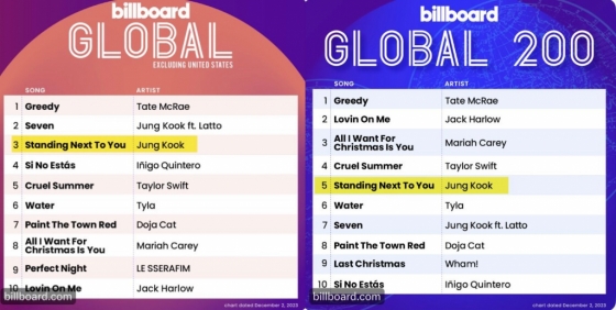 'Standing Next to You'는 전 세계 200개 이상 국가/지역의 스트리밍과 판매량을 집계해 순위를 매기는 빌보드 메인 주요 차트인 '글로벌(미국 제외)'과 '글로벌 200' 차트에서 각각 3위, 5위를 차지하며 3주 연속 두 차트 5위권 안에 진입하는 저력을 보여줬다.