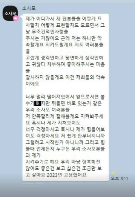 그는 또 "너무 멀리 떨어져 있어서 앞으로 서면 볼 수가 없지만, 뒤돌면 바로 있을 거 같은 우리 소사모 여러분들. 저 안 쪽팔리게 잘 해볼게요. 지켜봐주세요"라며 "혹시나 제가 지쳐보여도 너무 걱정 마시고 혹시나 제가 힘들어 보여도 걱정 마세요. 저 쉽게 안 무너지니까. 그러려고 시작한 거 아니니까"라며 진심을 털어놨다.