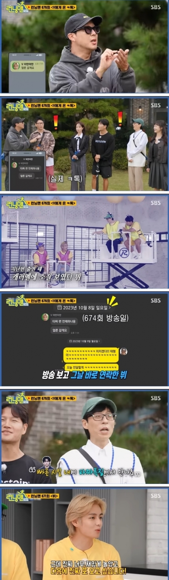 이어 유승호가 뷔에게 "아직도 '런닝맨' 최애 멤버가 하하 형님이시냐"고 묻자, 뷔는 "아니요. 전 지금 양세찬 형님으로 바뀌었다"라고 말했다. 그 이유로 "저희 팬미팅에 정말 크게 도움을 주셔서 정말 감사한 마음도 있지만, 세찬이 형님에 대한 존경심이 많이 커졌던 것 같다"고 밝혔다.