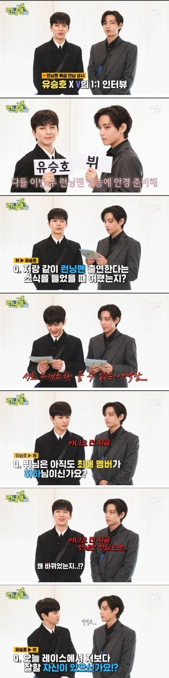 뷔와 유승호는 지난 11월 20일 '런닝맨' 녹화에 참여했다. 공개된 인터뷰 영상에서 뷔는 먼저 유승호에게 "저랑 같이 '런닝맨' 출연한다는 소식을 들었을 때 어떠셨나요?"라고 물었다.