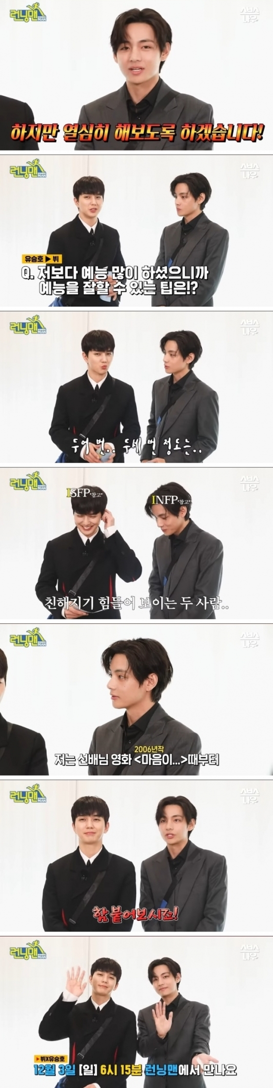 뷔는 "저보다 예능 많이 하셨으니까 잘할 수 있는 팁은?"이라는 유승호의 질문에 "제가 예능을 많이 해보지는 못했지만, 두세 번 정도는 했었다. 팁을 이야기해드리자면... 지금도 훨씬 잘하고 계신다"라며 수줍게 답했다.