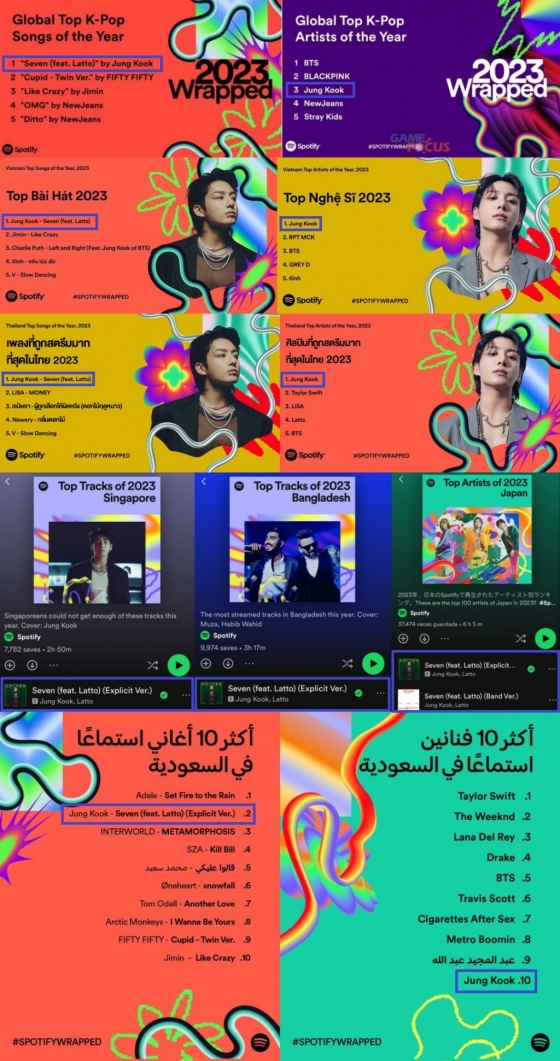 정국의 솔로 싱글 'Seven'(세븐)은 스포티파이 발표 2023년 연말 결산 차트 결과, 2023년 전 세계에서 가장 많이 스트리밍된 음원을 연말 결산 한 '톱 트랙 오브 2023' 부문에서 4위를 차지하며 글로벌 메가 히트송 명성을 입증했다.