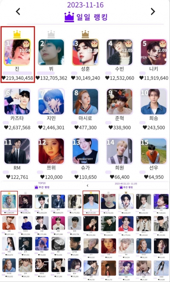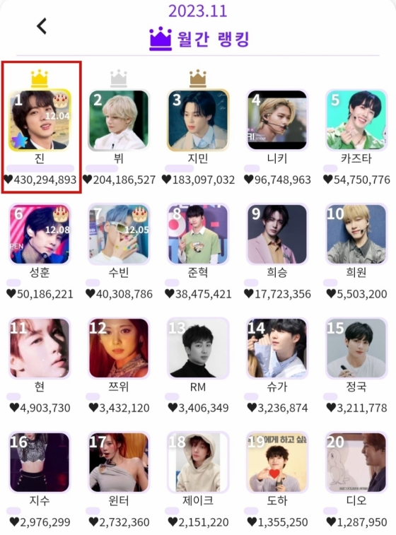 진은 K팝 아이돌 인기차트 앱 '케이돌'에서 진행된 11월 월간랭킹에서 4억 3029만 4893개의 하트 수를 기록하며 1위를 차지했다.