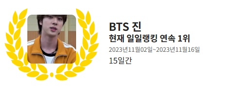 해당 투표에서 진은 11월 2일부터 11월 16일까지 일일랭킹 연속 15회 1위를 기록하며 케이돌 레코드를 달성했다.