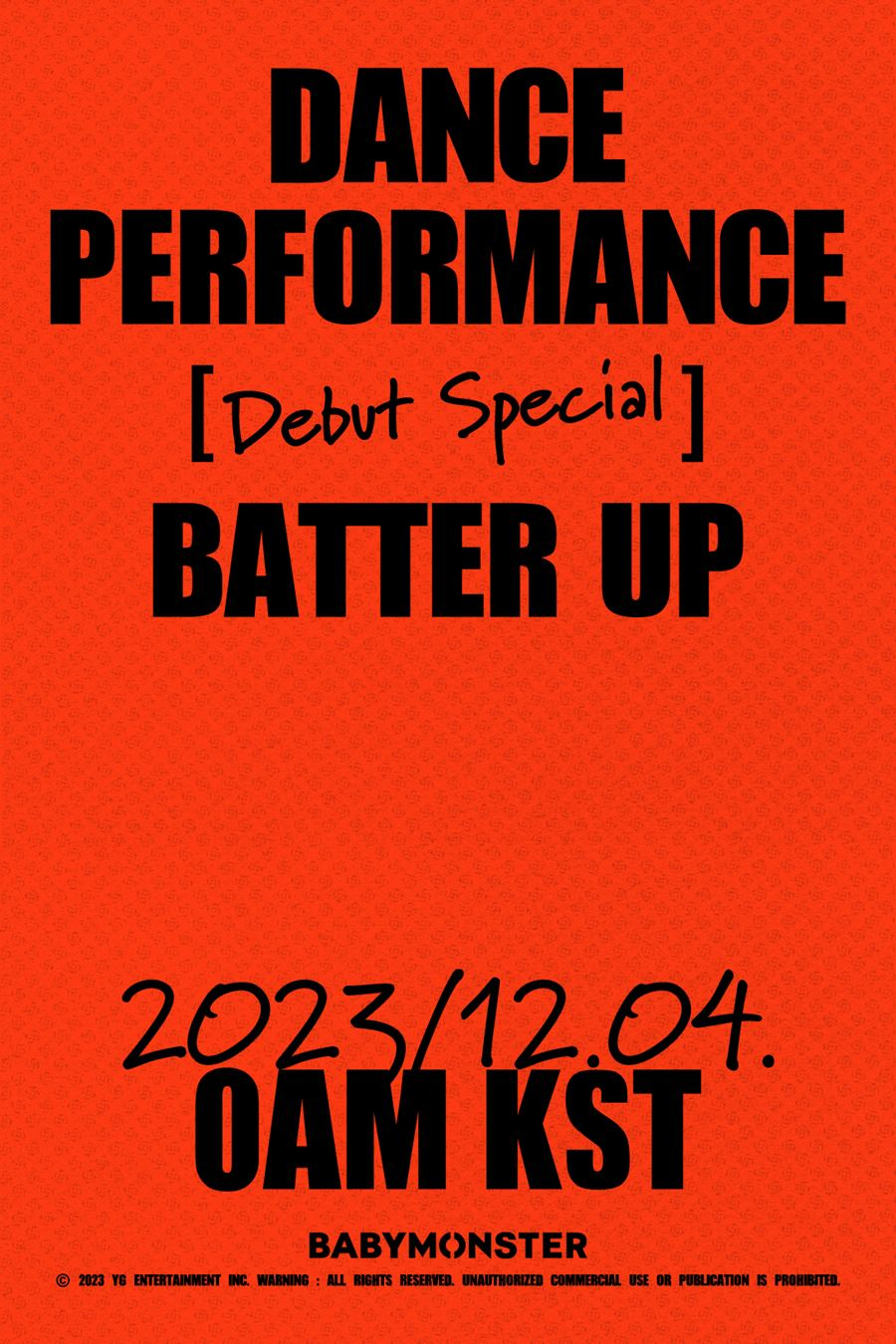 신인 걸 그룹 베이비몬스터의 데뷔곡 'BATTER UP' 댄스 퍼포먼스 영상이 오는 4일 0시(한국시간) 최초 공개된다.