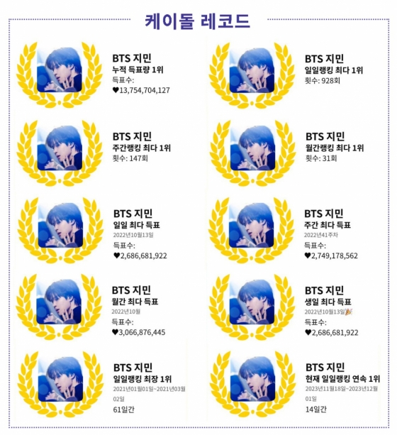 12월 2일 기준 지민은 누적 득표량 1위(137억 5470만 4127), 일일랭킹 최다 1위(928회), 주간랭킹 최다 1위(147회), 월간랭킹 최다 1위(31회), 일일 최다 득표(26억 8668만 1922), 주간 최다 득표(27억 4917만 8562), 월간 최다 득표(30억 6687만 6445), 생일 최다 득표(26억 8668만 1922), 일일랭킹 최장 1위(61일간), 현재 일일랭킹 연속 1위(14일간)로 케이돌 레코드 10개 부문을 모두 싹쓸이하며 10관왕에 올랐다.