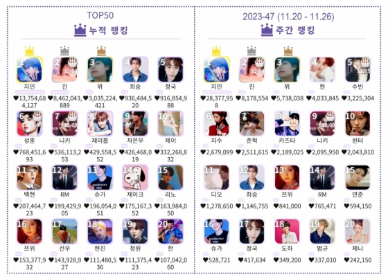 지민은 글로벌 K팝 아이돌 인기투표 '케이돌(KDOL)' 11월 넷째 주(2023년 11월 20일~11월 26일) 주간랭킹 결과 1위를 차지했다.