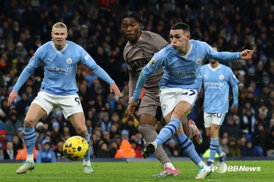 맨시티는 더욱 거세게 몰아붙였다. 그리고 완벽한 패스 플레이로 역전골을 뽑아냈다. 전반 32분 박스 외곽에서 볼을 잡은 도쿠가 문전으로 파고드는 알바레스를 향해 전진 패스를 찔렀다. 알바레즈가 수비수 시선을 모아놓은 뒤 중앙의 포든에게 다시 패스했다. 포든이 침착하게 컨트롤 후 오른발 슈팅으로 골망을 갈랐다.