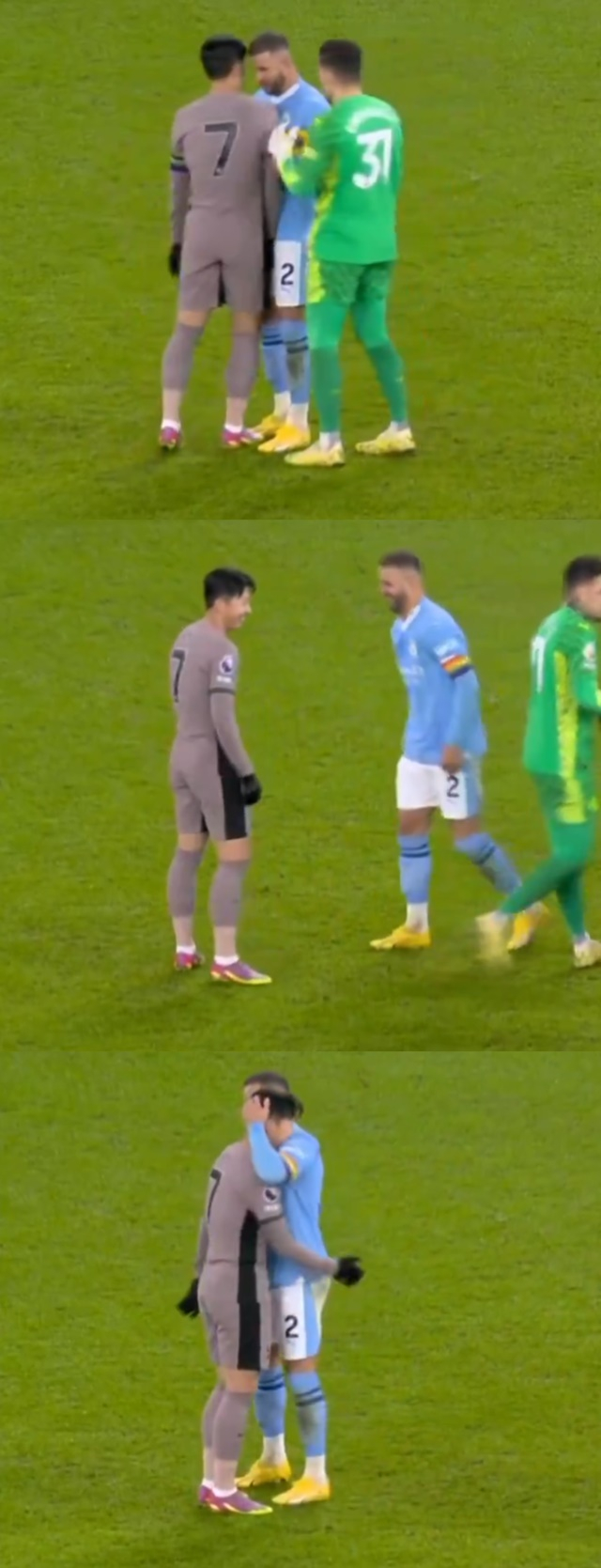 '캡틴' 손흥민(토트넘)이 그라운드 안에서 장난을 쳤다. '옛 동료' 카일 워커(맨시티)와 만나 훈훈한 미소를 지었다.