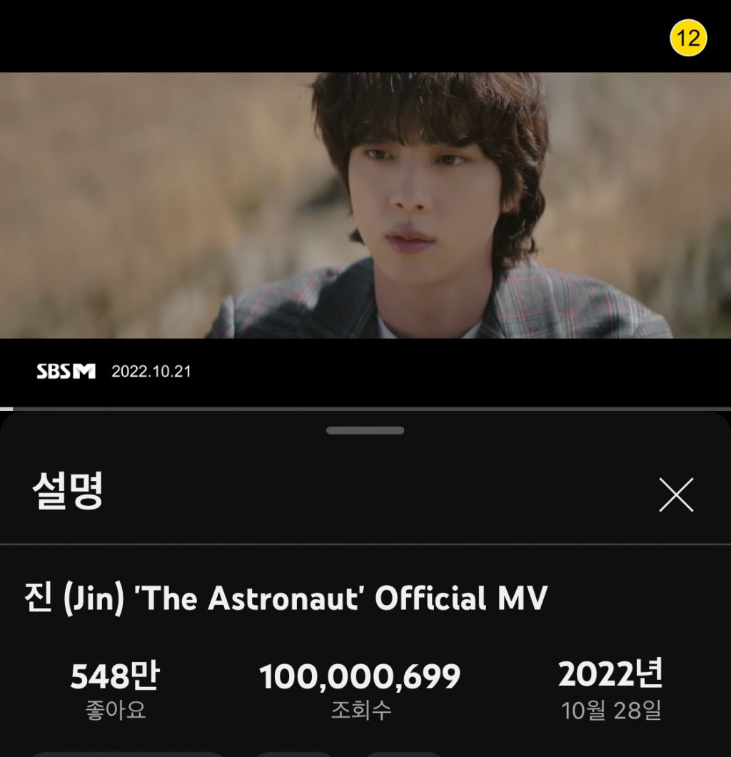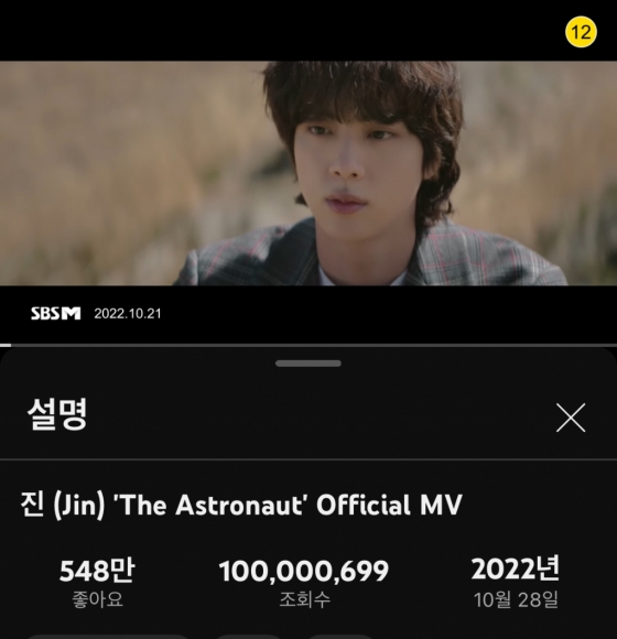방탄소년단(BTS) 진의 생일인 12월 4일 '디 애스트로넛'(The Astronaut) 뮤직비디오가 1억뷰를 달성하며 생일 축제의 하이라이트를 장식했다.