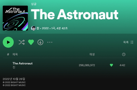 '디 애스트로넛' 음원은 세계 최대 음원 플랫폼 스포티파이(Spotify)에서 최근 2억 9808만 (4일 현재 298,089,972회) 스트리밍을 돌파하며 3억을 눈앞에 두고 있다.