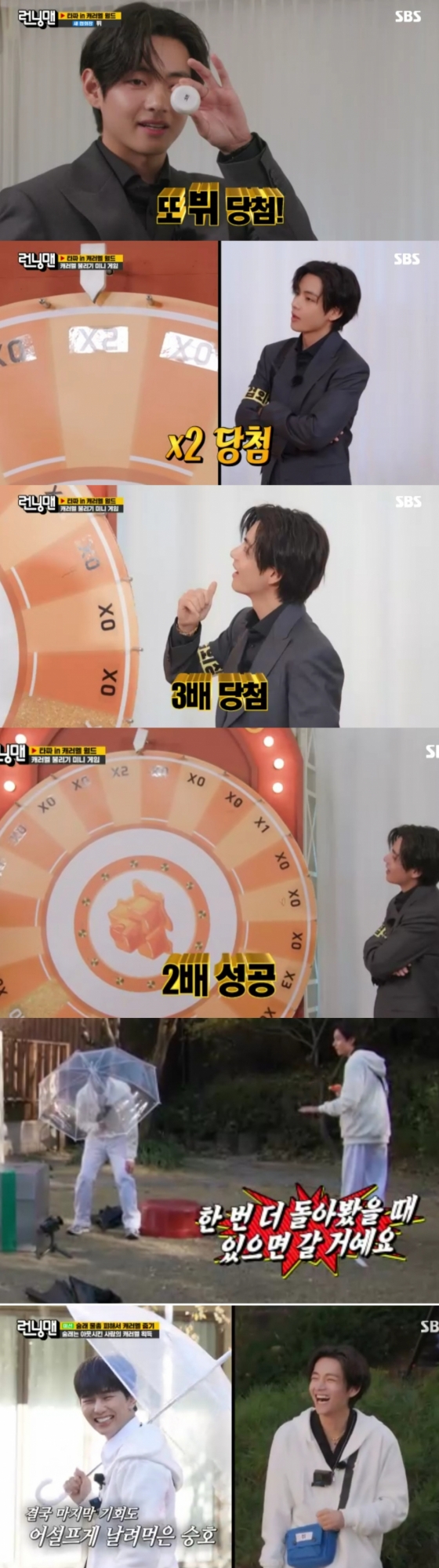 '술래의 물총 피해 캐러멜 줍기'에서 술래가 된 뷔는 캐러멜 빈털터리 유승호에게 "한 번 더 돌아봤을 때 있으면 갈 거예요"라며 기회를 줬다. 하지만 한 발짝 정도만 이동한 채로 있었던 유승호는 결국 물총을 맞고 아웃되면서 귀여운 허당미로 웃음을 선사했다