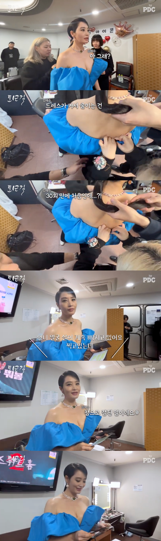 김혜수는 또 드레스를 입던 중 뒷부분을 조금 줄였으면 좋겠다는 말에 깜짝 놀랐다. 김혜수는 "드레스가 커서 줄이는 건 30년 만에 처음이다"며 "매번 '괜찮아 괜찮아 할 수 있어' 그랬는데"라 말해 웃음을 안겼다.