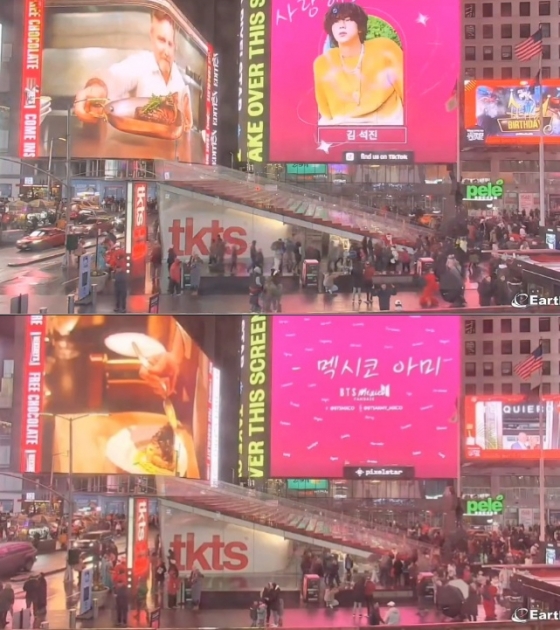 멕시코 아미들인 BTS MEXICO(@BTSARMY_MXCO)는 현지 시간 4일 뉴욕 타임 스퀘어에서 진의 생일 축하 영상 광고를 서포트했다.