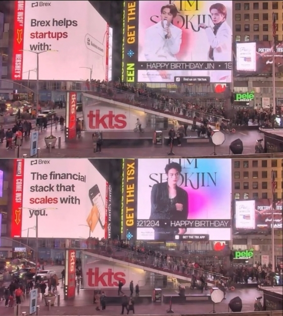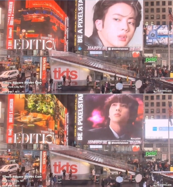 진의 미국팬 Kim Nasha BLOG(@NashaTriple)는 현지 시간 4일 진의 생일을 축하하며 뉴욕 타임 스퀘어에 영상 광고를 송출했다.