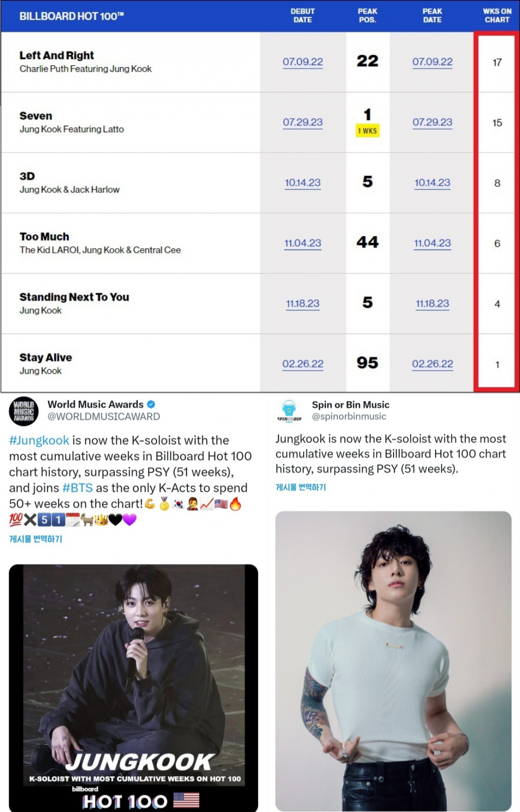 또한 정국은 '핫 100' 차트에 50주 이상을 보낸 유일한 K팝 가수로 방탄소년단의 기록에 합류했다.