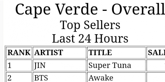 진의 자작곡이자 솔로곡 '슈퍼참치'는 12월 6일(한국시간) 카보베르데(Cabo Verde) 아이튠즈 1위에 올랐다. 진의 솔로곡인 '어웨이크'(Awake) 또한 카보베르데 아이튠즈 2위를 차지하며 진의 생일(12월 4일) 이후 겹경사를 맞았다.