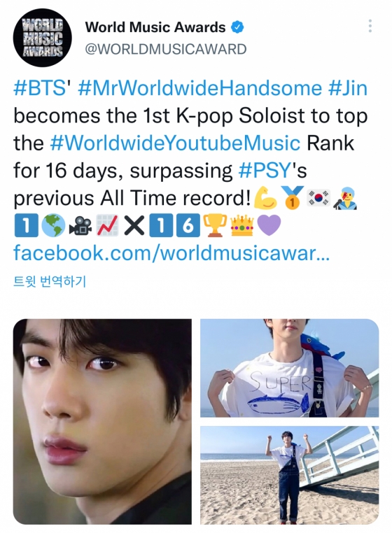 진과 콜드플레이가 함께 작곡, 작사한 진의 솔로곡 '디 애스트로넛'(The Astronaut) 뮤직비디오가 '전 세계 유튜브 인기 동영상 음악 부문'에서 K팝 솔로 최초이자 최장인 17일 연속 1위를 기록하기 전까지 '슈퍼참치'는 16일 연속 1위 기록으로 K팝 솔로 최고 기록을 세우기도 했다.