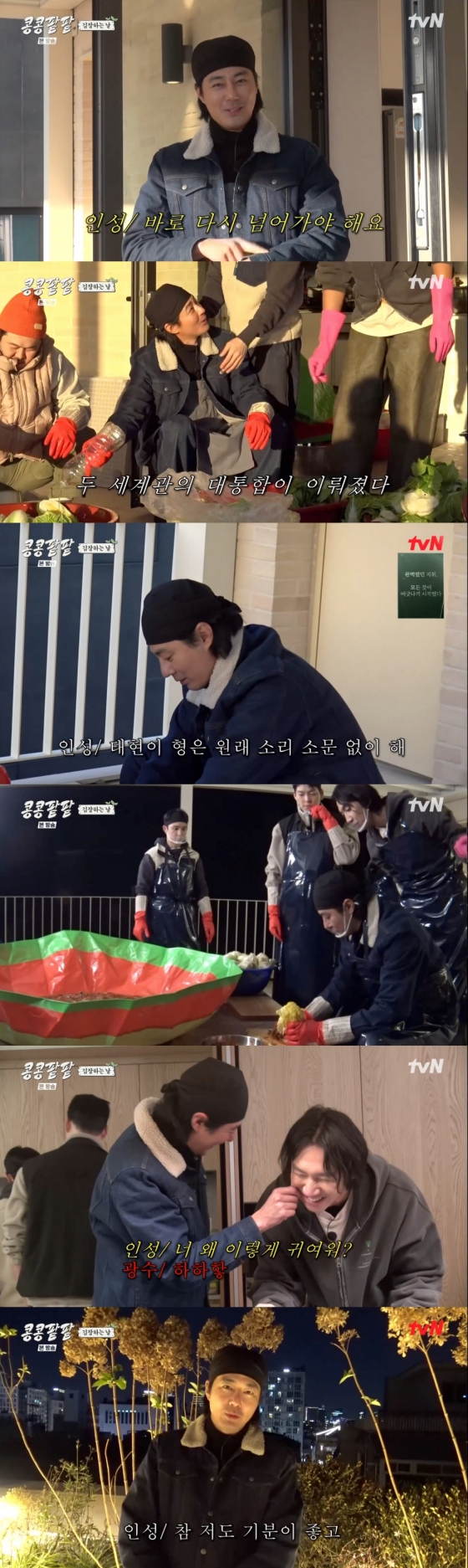 지난 8일 방송된 tvN 예능 '콩콩팥팥' 9화에서는 조인성이 김장 도우미로 등장해 멤버들과 함께 김장에 나서는 모습이 그려졌다. tvN '어쩌다 사장3'의 조사장님과 '콩콩팥팥' 멤버들의 '절친 케미'가 안방극장을 웃음으로 물들였다.