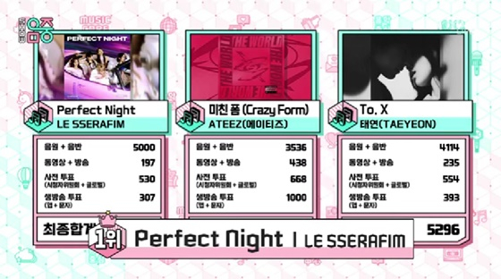 9일 방송된 MBC '쇼! 음악중심'에서는 르세라핌의 'Perfect Night', 에이티즈의 '미친 폼(Crazy Form)', 태연의 'To. X'가 1위 후보에 이름을 올린 가운데 르세라핌이 1위 트로피를 품에 안았다.