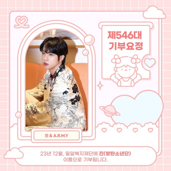 진은 생일인 12월 4일에 팬들의 뜨거운 응원과 지지로 1억 7078만 2610개의 하트를 받아 남자 개인 순위 1위에 등극, 동시에 제546대 기부 요정으로 선정됐다.