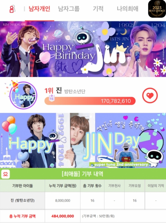 '최애돌'은 최근 30일 동안의 누적 순위를 환산해 1위를 달성하면 기부 천사, 각종 기념일에 5555만 5555표 이상을 달성하면 기부 요정으로 선정한다. 진은 생일 당일 기부 요정 커트라인을 훌쩍 넘기며 막강한 팬덤 파워와 글로벌 인기를 또 한 번 입증했다.