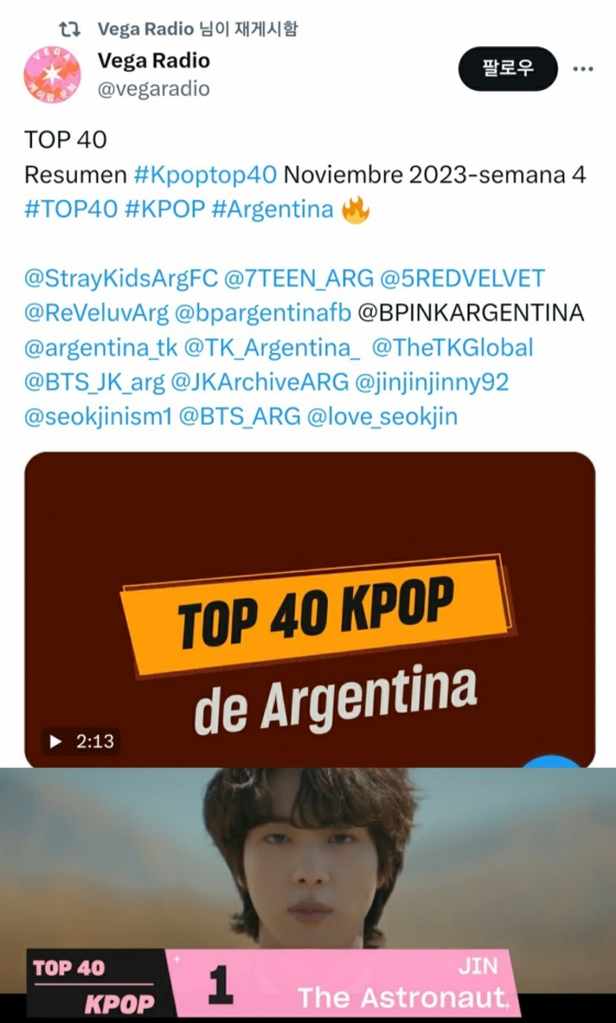 방탄소년단(BTS) 진의 '디 애스트로넛'(The Astronaut)이 아르헨티나(Argentine) 인기 라디오 채널에서 1위 행진을 이어가며 뜨거운 인기를 자랑했다.