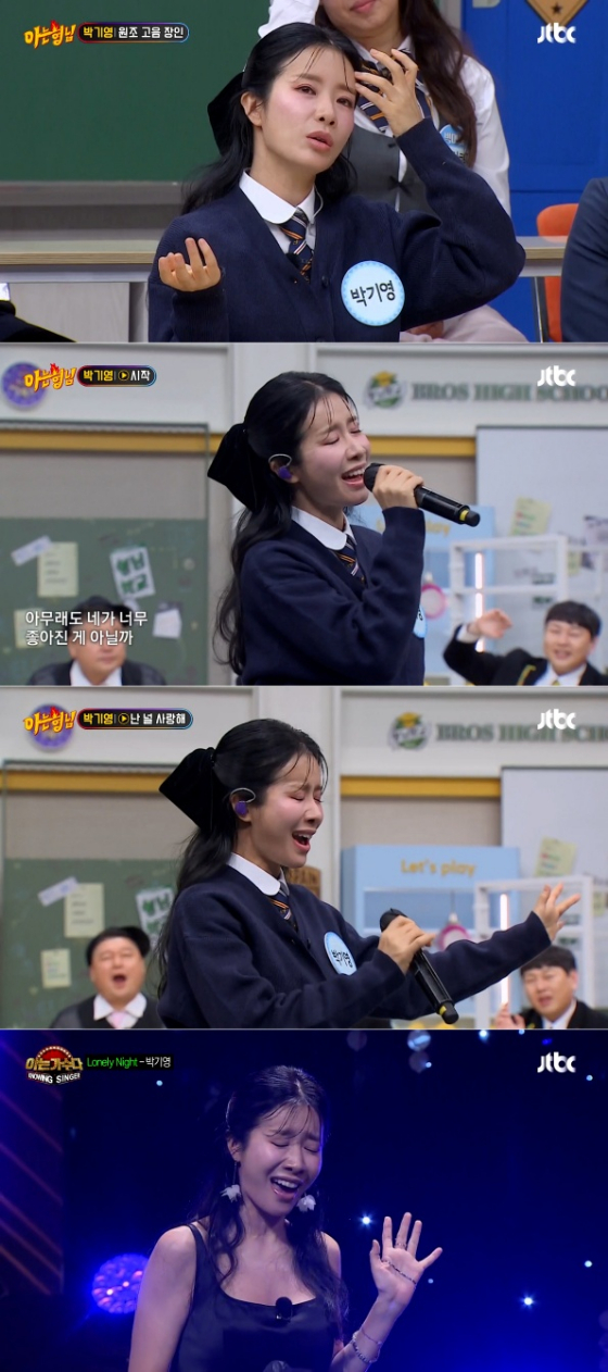 다음으로 펼쳐진 '아는 가수다' 코너에서는 이날 출연진들의 노래 대결이 진행된 가운데, 박기영은 'Lonely Night' 선곡으로 시원한 터져 나오는 고음을 라이브로 선사하면서 출연진 모두를 소름 돋게 했다.