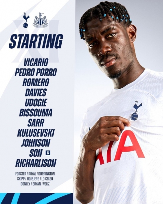 토트넘은 4-2-3-1 전형을 들고나왔다. 최전방에 히샬리송이 출격했다. 2선엔 손흥민-데얀 쿨루셉스키-브레넌 존슨이 공격을 지원했다. 중원에는 이브 비수마-파페 사르가 나왔다. 포백은 데스티니 우도지-벤 데이비스-크리스티안 로메로-페드로 포로가 선발 출전했다. 골문은 굴리엘모 비카리오가 지켰다.