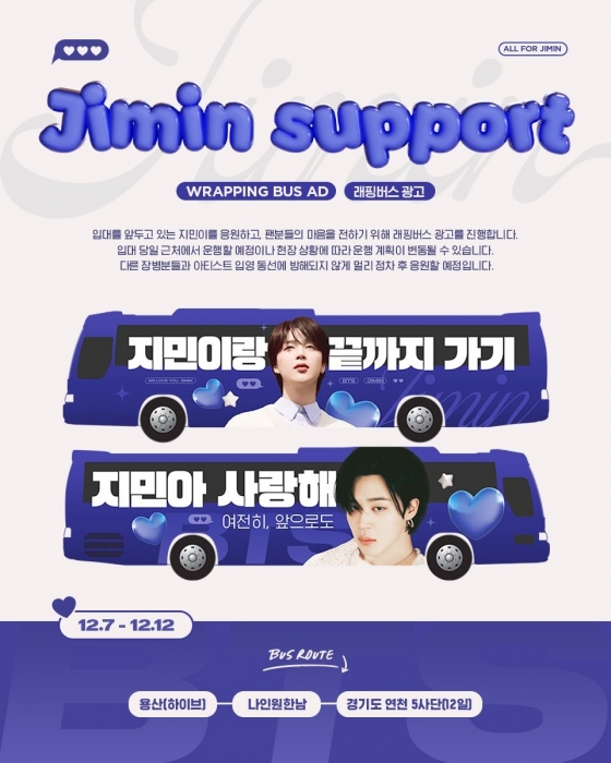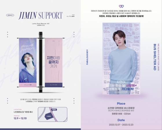 지민의 한국 팬베이스 올포지민코리아(ALLFORJIMIN_KOR)가 지난 12월 9일부터 10일까지 팬들의 마음을 전하기 위한 가로등 배너 광고에 이어 12월 7일부터 12일까지 래핑버스 광고를 운행한다.