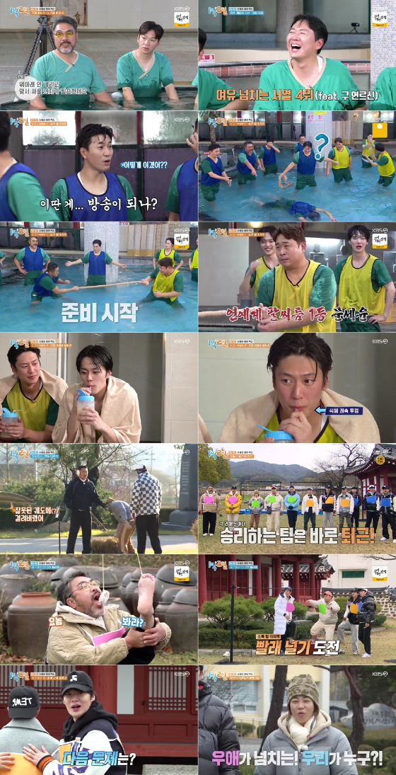 이날 찐친 형님들과 아우들은 따뜻한 온천으로 향한 뒤 잠자리 복불복을 진행했다. 열두 남자는 나이 순서대로 여섯 명씩 OB팀(이원종, 정상훈, 천명훈, 연정훈, 김종민, 김동현)과 YB팀(문세윤, 슬리피, 안재현, 딘딘, 나인우, 유선호)으로 나뉘어 팀을 이뤘고, 3라운드에 걸쳐서 진행되는 릴레이 복불복에 본격 돌입, 모두의 승부욕을 들끓게 했다.