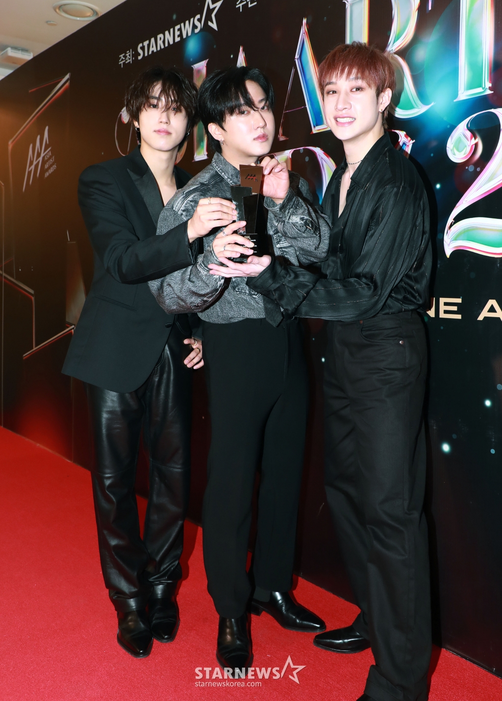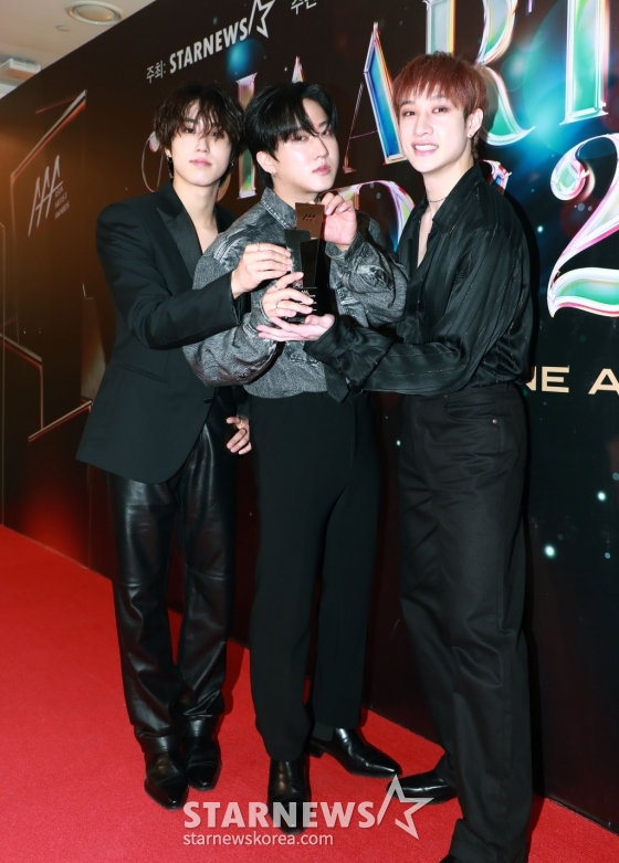 스트레이키즈 유닛 그룹 쓰리라차가 14일 필리핀 아레나에서 열린 '2023 아시아 아티스트 어워즈 인 필리핀'(2023 Asia Artist Awards IN THE PHILIPPINES, 이하 '2023 AAA')에서 AAA 베스트 크리에이터 상을 수상한 뒤 포즈를 취하고 있다.