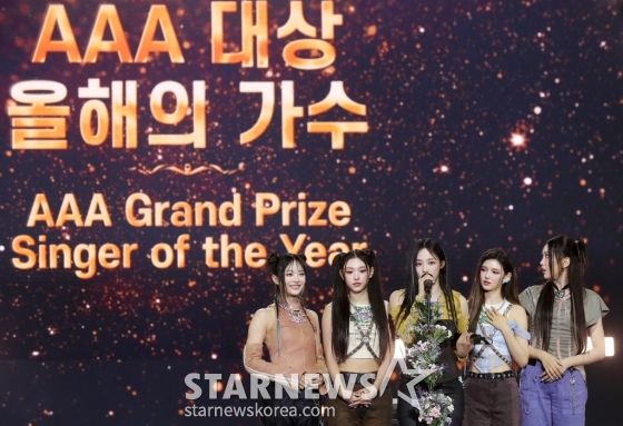 걸그룹 뉴진스가 14일 필리핀 아레나에서 열린 '2023 아시아 아티스트 어워즈 인 필리핀'(2023 Asia Artist Awards IN THE PHILIPPINES, 이하 '2023 AAA')에서 대상 올해의 가수상을 수상한 뒤 소감을 말하고 있다.
