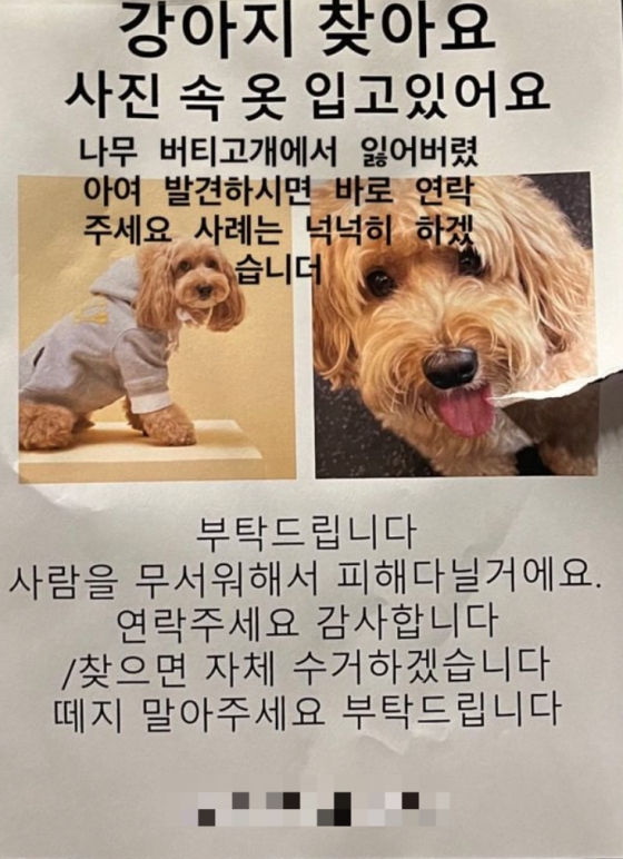 사진에는 "강아지 찾아요. 사진 속 옷 입고 있어요. 나무 버티고개에서 잃어버렸어요. 발견하시면 바로 연락주세요. 사례는 넉넉히 하겠습니다"라는 문구가 적혀 있다.