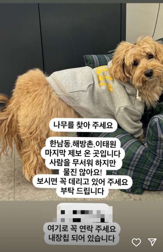 또한 이 지인은 이 강아지가 한남동 해방촌 이태원에서 마지막 제보가 왔다며 "사람을 무서워 하지만 물지 않아요. 보시면 꼭 데리고 있어주세요. 부탁드립니다"라고도 적혀 있었다.