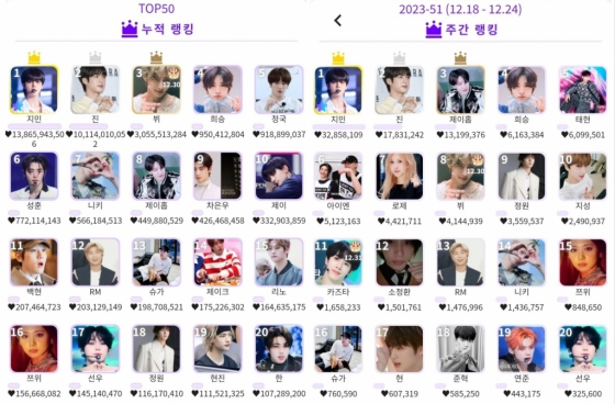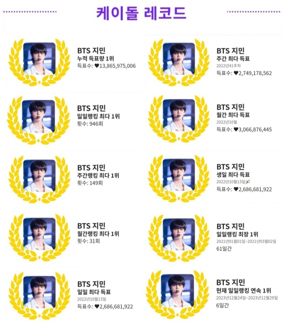 지민은 글로벌 K팝 아이돌 인기투표 '케이돌(KDOL)'의 12월 셋째주(2023년 12월 18일 - 2023년 12월 24일) 주간랭킹에서 3285만 8109개의 하트를 받아 1위를 차지하며 149회째 주간랭킹 1위를 기록했다.